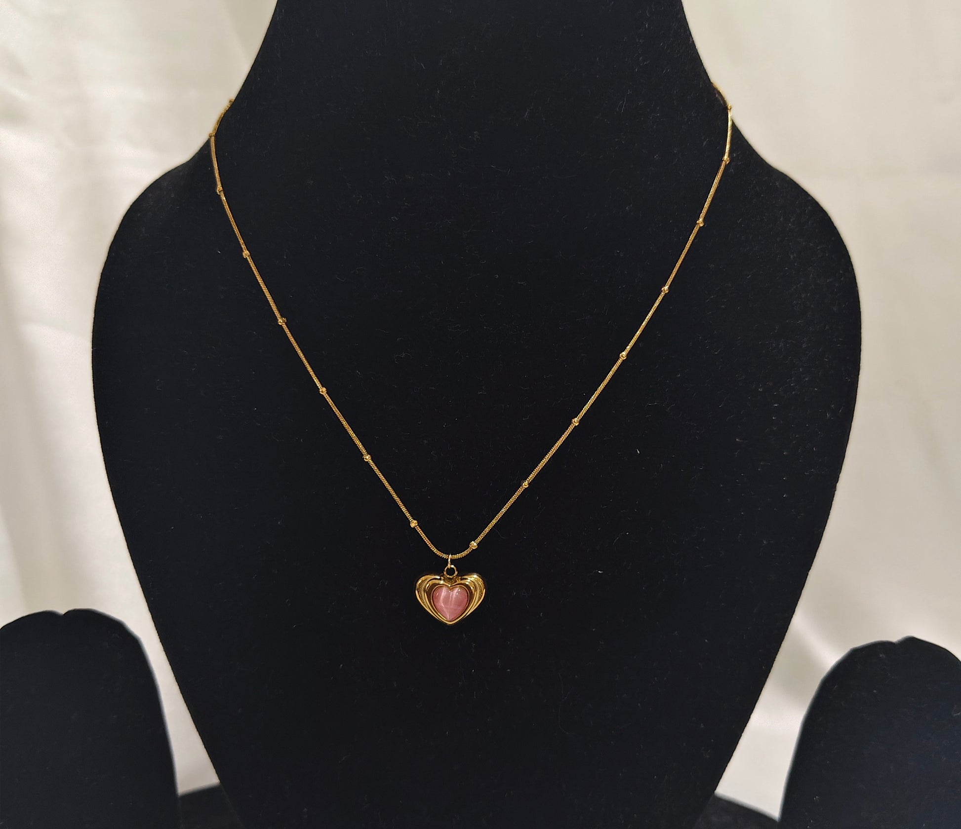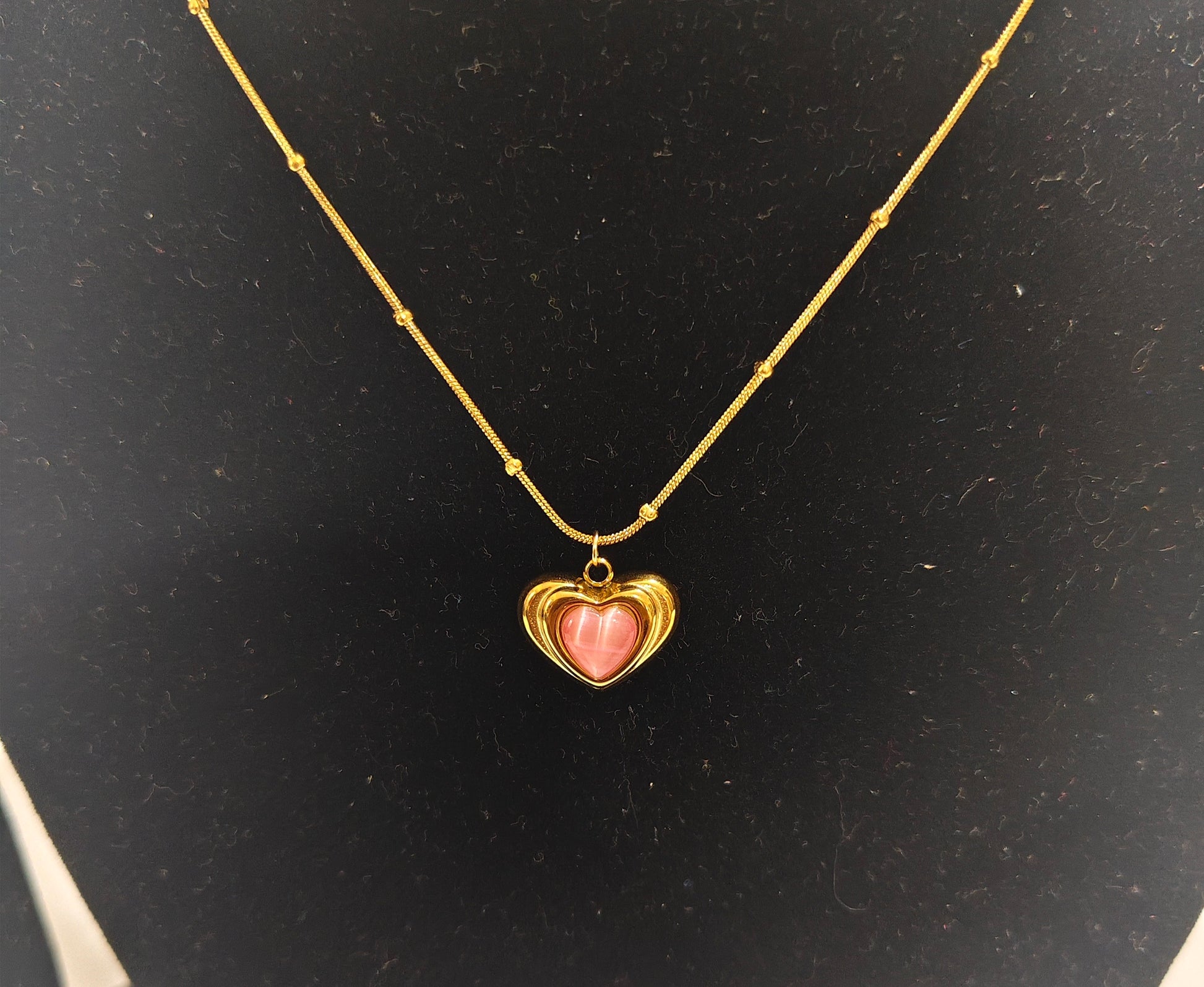 Add a touch of romance and elegance to your look with our Gold Plated Pink Heart Charm Necklace. Designed with a sleek beaded chain and a beautifully polished pink heart stone, this necklace radiates charm and femininity.