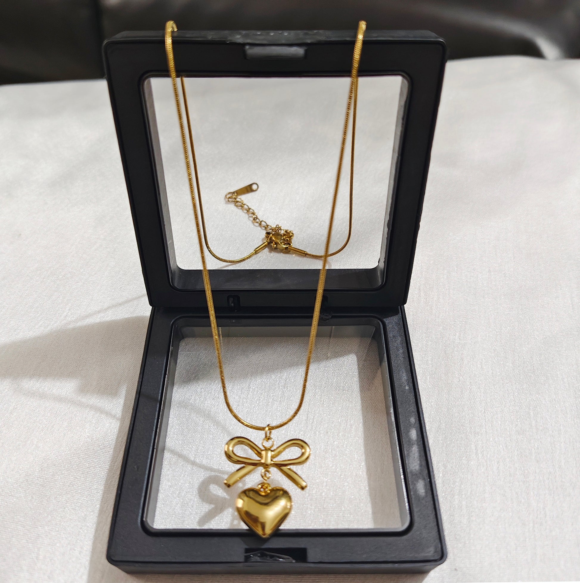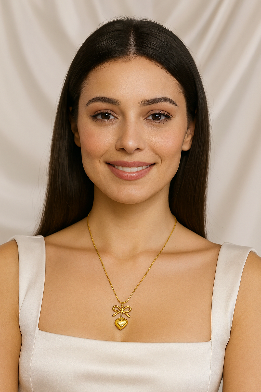 This Golden Bow Heart Necklace is a stunning blend of elegance and charm. Featuring a polished bow knot with a dangling heart pendant, it beautifully enhances both casual and festive outfits. Crafted with high-quality gold plating and a smooth snake chain, it is skin-friendly, long-lasting, and perfect for women who love subtle yet stylish jewelry.
